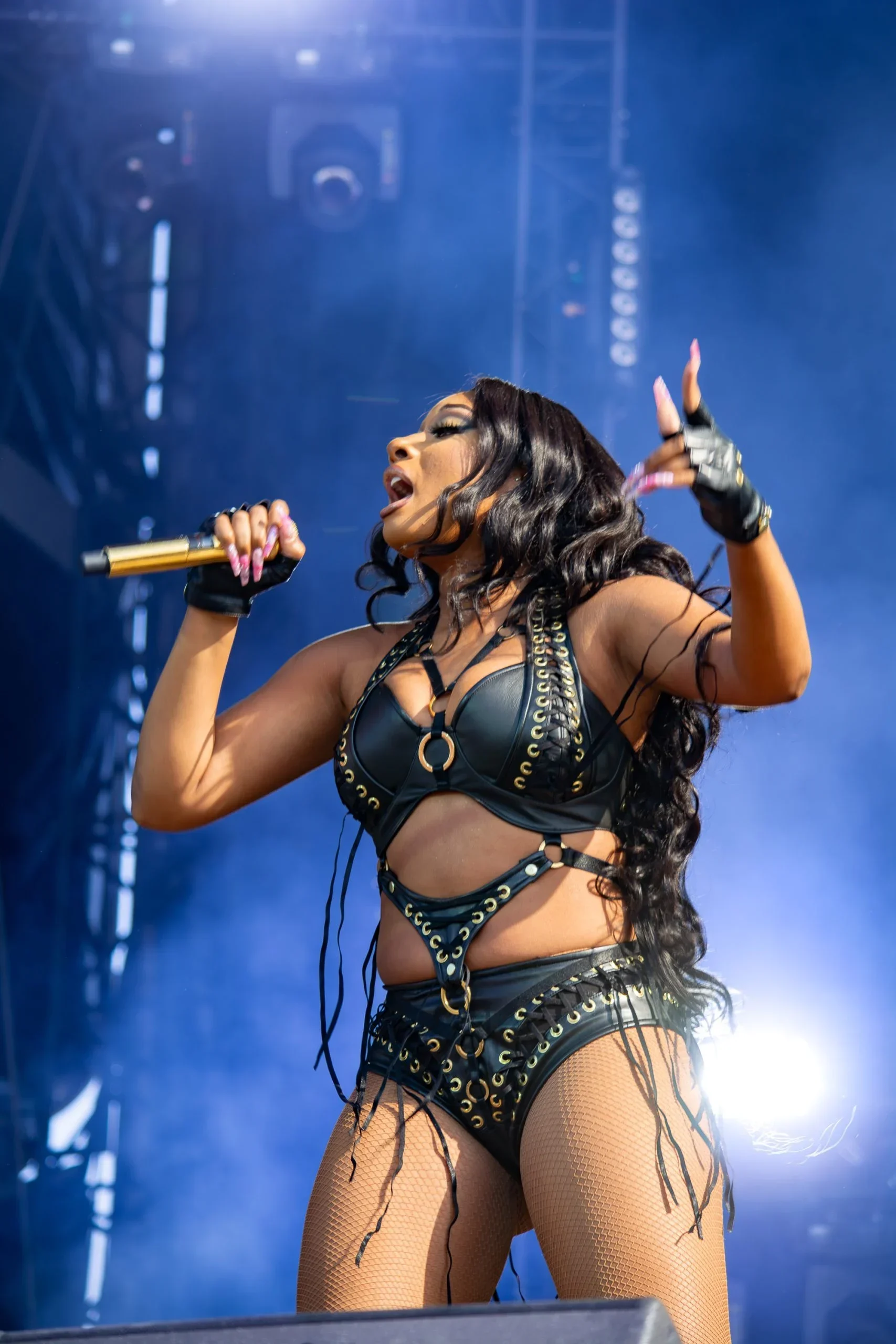 Maîtrise des éclairages scéniques extrêmes contre-jours, spots colorés, jeux d'ombres dramatiques qui définissent l'image live.
